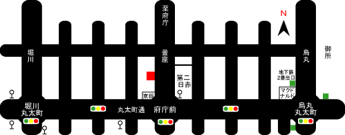 | 【地下鉄でご来店される方】 地下鉄烏丸線「丸太町駅」下車 2番出口>西へ約400m(出口を右に曲がって右に曲がる) >右手ケヤキ並木の広い道(釜座)を渡って右に曲がると100m左手 |